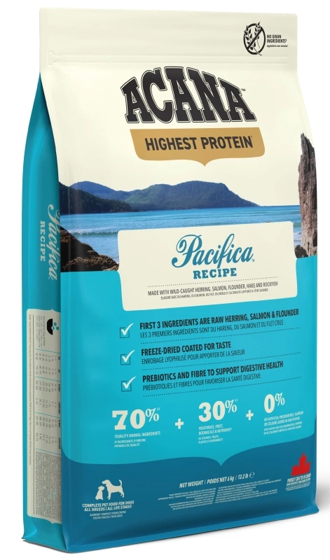 ACANA Pacifica to odzwierciedlenie bogactwa ryb, poławianych w zimnych, krystalicznych wodach Pacyfiku. Przepełniona jest świeżymi rybami, które poławiane są w sposób zrównoważony w naturalnym środowisku.