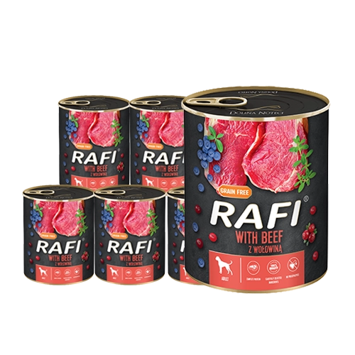 Mokra karma Rafi z wołowiną charakteryzuje się wysoką zawartością pełnowartościowego białka przy niskiej zawartości tłuszczu. Oprócz tego mięso i surowce pochodzące z wołowiny są cennym źródłem lizyny i histydyny. Ważnymi substancjami są również kwasy tłuszczowe z rodzin n-3 i n-6, regulujące pracę wielu funkcji życiowych dorosłych psów. Karma zawiera żelazo zapewniające prawidłową gospodarkę krwi, a także selen i cynk, pokrywając dzienne zapotrzebowanie na te składniki. Receptura została wzbogacona o dodatek borówki i żurawiny, które dzięki występujących w nich związkach biologicznie czynnych, głównie procyjanidyn i flawonoidów, wykazują silne właściwości przeciwutleniające i przeciwzapalne. Tymianek z kolei działa antybakteryjnie i korzystnie wpływa na funkcje trawienne.