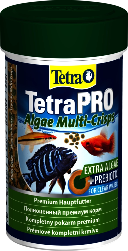 Pokarm premium o wysokiej wartości odżywczej. Tetra Pro Multi-Crisps łączą w sobie korzystne działanie podstawowych pokarmów Tetra ze specjalnym dodatkiem. Ta wyjątkowa mieszanka dostarcza rybom optymalną ilość niezbędnych składników odżywczych, takich jak wysokiej jakości tłuszcze, specjalnie wyselekcjonowane karotenoidy i skoncentrowane glony Spirulina. Środek każdego Multi-Crisp zawiera dodatkowe składniki odżywcze. Z każdy kęsem pokarmu, ryby pobierają odżywczy pokarm podstawowy oraz wartościowe dodatki odżywcze! Wszystkie pokarmy w chrupkach są wytwarzane za pomocą technik niewymagających stosowania wysokich temperatur. Delikatny proces obróbki zapewnia optymalne proporcje białek i tłuszczów, które pozwalają na lepsze wykorzystanie składników odżywczych zawartych w pokarmie. Regularnie podawany, pokarm ten pozwala zmniejszyć zanieczyszczenie wody, zredukować poziom azotanów i zapewnić lepszą jakość wody. Tetra Pro Algae to pokarm premium dla wszystkich gatunków ryb ozdobnych wzmacniający odporność na choroby.