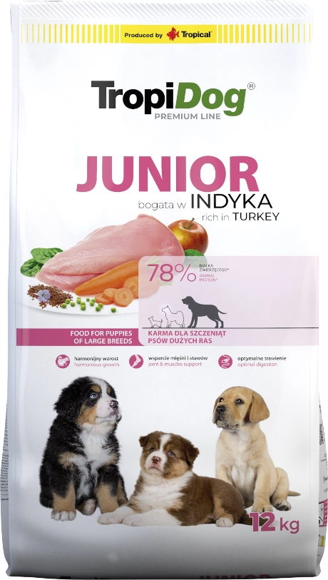 TropiDog Premium Junior LARGE BREEDS ‒ Rich in TURKEY, with RICE to karma Premium bogata w indyka, z ryżem, dla szczeniąt psów dużych ras (od 2. do 15. miesiąca życia) oraz suk w okresie ciąży i laktacji. Zawiera wysoko przyswajalne białko z indyka oraz warzywa, owoce i glony kelp (Ascophyllum nodosum). Precyzyjnie dobrane i odpowiednio zbilansowane składniki oraz wysoka strawność pokarmu zapewniają harmonijny rozwój szczeniąt podczas długiego okresu wzrostu typowego dla dużych ras psów.