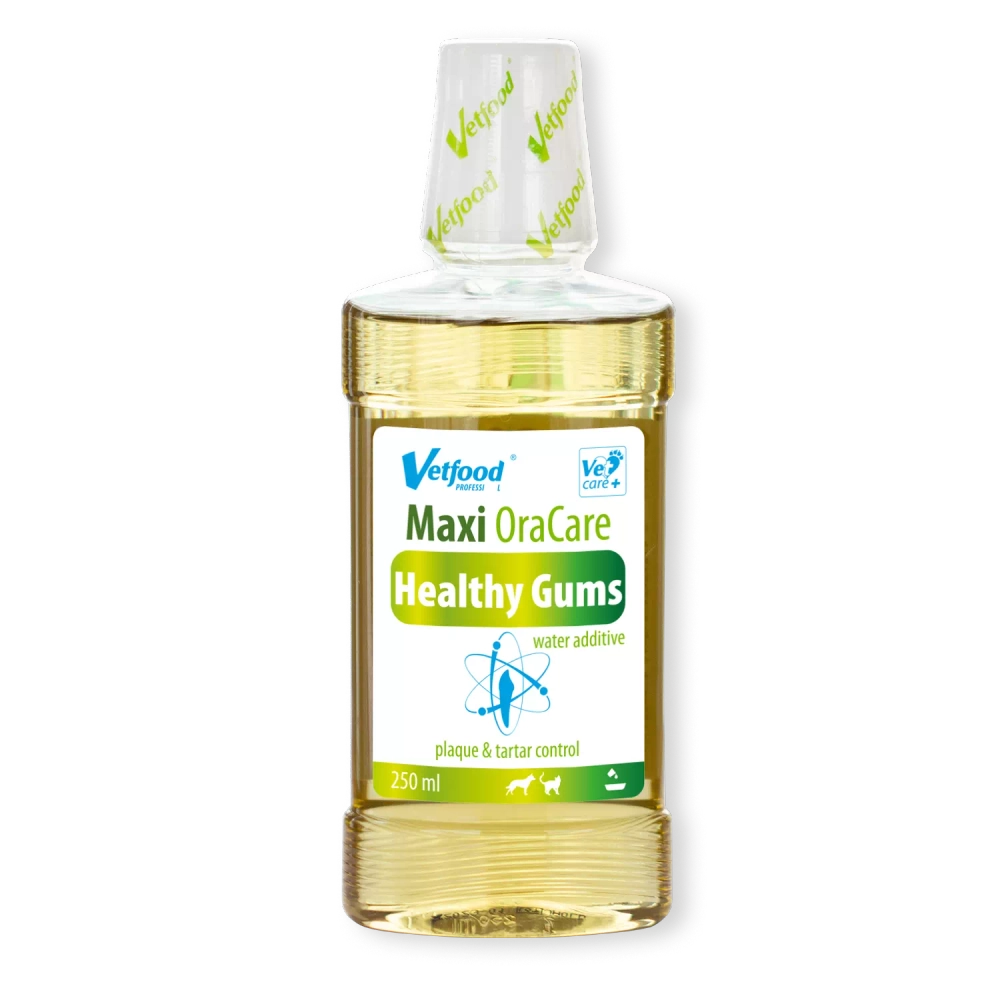 Płyn Maxi OraCare Healthy Gums to dodatek do wody dla psów i kotów o neutralnym pH, który przyczynia się do redukcji zaburzeń mogących przyczynić się do zapalenia dziąseł i chorób przyzębia.