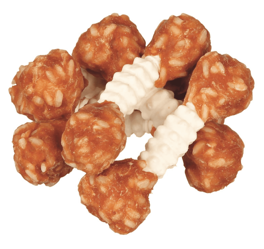 Przysmak hantel Denta Fun z kurczakiem i ryżem. Pomaga w utrzymaniu higieny jamy ustnej i zapewnia świeży oddech. Wzmacnia zęby i mięśnie szczęki.