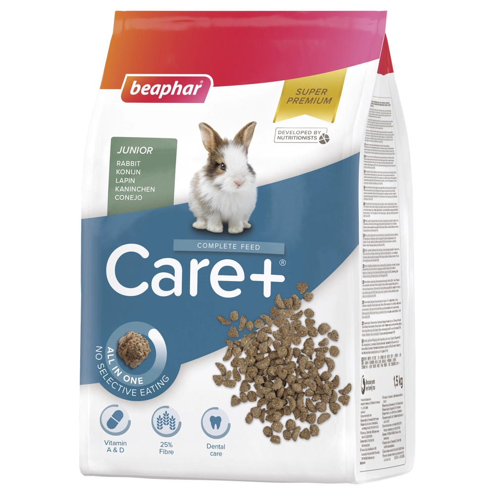 Króliki od 3. tygodnia życia powinny mieć już możliwość spożywania niewielkich ilości Care+ Rabbit Junior wraz z sianem jako uzupełnienie naturalnej diety mlecznej od matki. Odsadzanie młodych królików przeprowadza się miedzy 6. a 10. tygodniem życia i w tym czasie młode powinny być już przyzwyczajone do spożywania suchej karmy. Bezpośrednio po zakupie króliczka należy przez pierwszy tydzień karmić go takim samym pokarmem jaki otrzymywał w sklepie zoologicznym. W drugim i trzecim tygodniu należy stopniowo zwiększając udział w dawce dobowej Care+ Rabbit Junior, ostatecznie podając karmę do woli. Karmienie królików sposobem "do woli" powinno być kontynuowane do wieku 6 miesięcy, a powyżej tego okresu w ilości 35 g karmy na 1 kg masy ciała dziennie w dwóch dawkach podzielonych. W wieku 9-10 miesięcy można już stopniowo przyzwyczajając króliki do podawania Care+ Rabbit dla dorosłych królików. Dla królic ciężarnych i w okresie laktacji poleca się podawać nieograniczona porcje Care+ Rabit Junior. Należy podawać codziennie świeże pożywienie i czysta wodę do picia oraz zapewnić nieograniczony dostęp do świeżego siana.