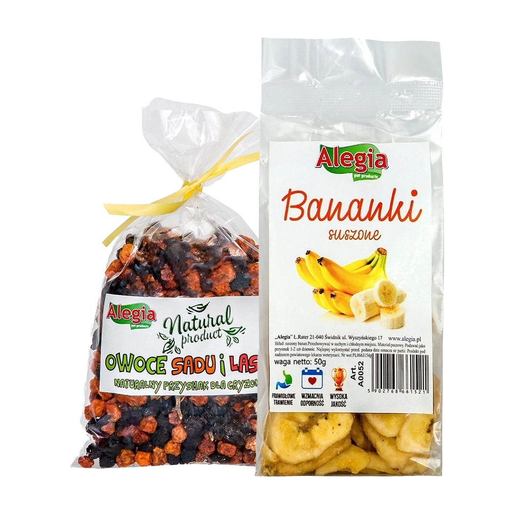 Przysmak Banany suszone 50g Alegia to doskonałe urozmaicenie diety gryzoni i królików, która dostarcza niezbędnych składników mineralnych i witamin. To w 100 % naturalny, zdrowy przysmak który zawiera m in. potas, witaminę C i B oraz magnez. Ze względu na zawartość cukru nie należy podawać ich koszatniczkom !