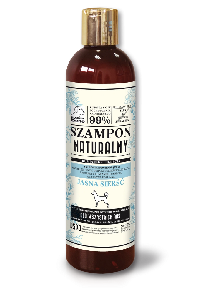 Szampon naturalny dla psów wszystkich ras, który został stworzony tak, aby uwzględniać potrzeby psów z jasną sierścią. Ponadto to linia szamponów, która nie tylko troszczy się o naszych pupili, ale także o środowisko naturalne. Podczas produkcji zastosowane składniki myjące są pozyskiwane z surowców naturalnych, roślinnych. Wielką zaletą tych surowców jest łagodność dla skóry zwierząt. Mają one silne właściwości nawilżające i nie podrażniają skóry.