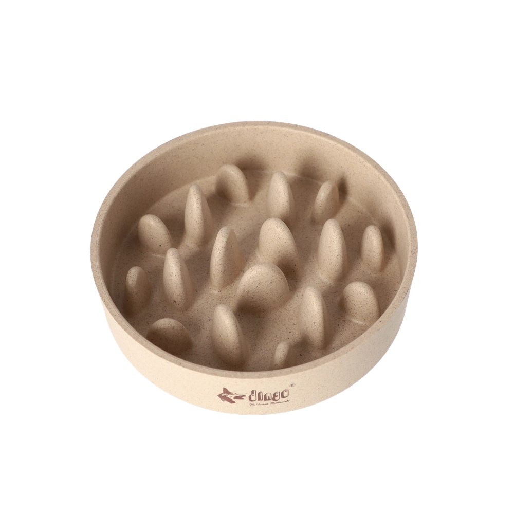 Miski spowalniające jedzenie wykonane są z naturalnego i ekologicznego tworzywa bambusowego. Dedykowane są psom, które zbyt szybko i łapczywie jedzą. Posiadają specjalne wypustki, które uniemożliwiają psu za szybkie zjadanie pokarmu. W efekcie jest wydłużamy psu czas jedzenia poprzez zmniejszenie ilości połykanej porcji karmy. Zwierzę, które je zbyt szybko, nie gryzie pokarmu lub go łapczywie połyka. Pochłania przy tym bardzo dużo powietrza, co często skutkuje problemami gastrycznymi. Miski spowalniające jedzenie pomagają nam wyeliminować ten problem. Dzięki nieco skomplikowanemu procesowi wydobywania karmy spośród zakamarków miski, pies uspokaja się, a także wyładowuje zapasy energii.
