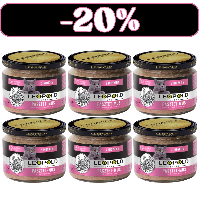 6x Leopold Pasztetowy mus z mięsem indyka dla kotów 300g (Słoik)Cena: 5,94 zł / szt.