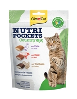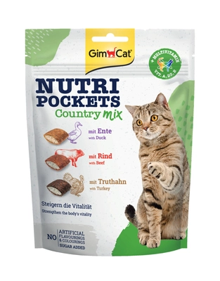 GimCat Nutri Pockets Country Mix to chrupiące poduszeczki z pysznym nadzieniem. Zawiera witaminy A,E i D3, które wzmacniają układ odpornościowy organizmu. Nie zawiera sztucznych aromatów i barwników. Bez dodatku cukru.