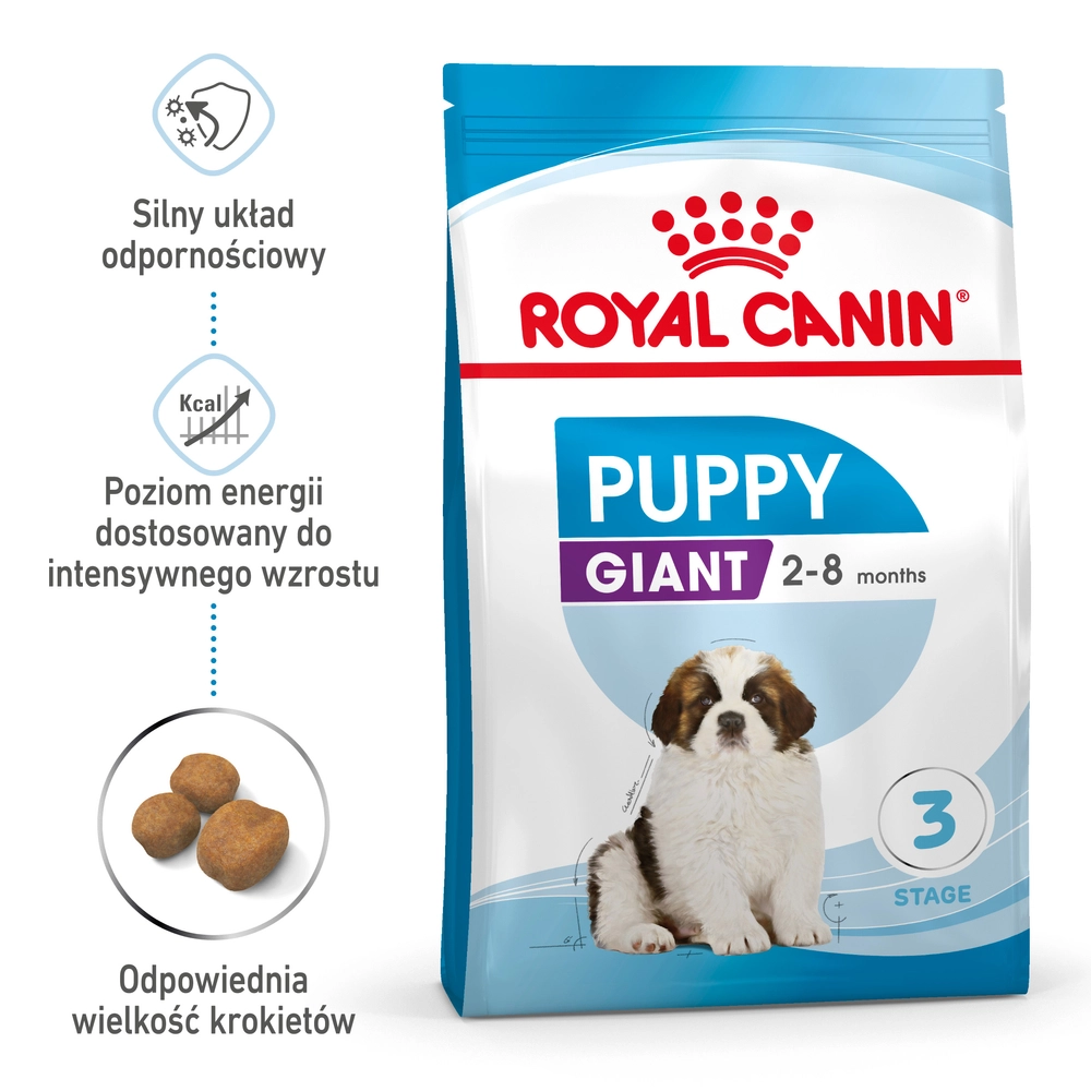 Karma sucha ROYAL CANIN® Giant Puppy została specjalnie opracowana, aby pokrywać w pełni potrzeby pokarmowe szczeniąt ras olbrzymich. Karma jest przeznaczona dla szczeniąt ras olbrzymich w wieku od 2 do 8 miesięcy, które po zakończeniu wzrostu osiągną masę ciała powyżej 44 kg.