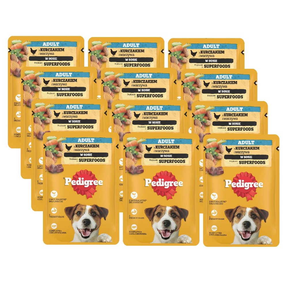 Mokra karma PEDIGREE® Adult z kurczakiem i warzywami w aksamitnym sosie to pełnoporcjowe pożywienie przeznaczone dla dorosłych psów. Nasze receptury na sosy zawierają superfoods, takie jak: jabłko, źródło witaminy C i błonnika oraz słodkie ziemniaki, źródło potasu. Receptura została opracowana przez lekarzy weterynarii i specjalistów ds. dietetyki z Instytutu Nauki o Zwierzętach WALTHAM™. Zawiera w składzie witaminę E i przeciwutleniacze, które posiadają właściwości antyoksydacyjne i wspomaga naturalne mechanizmy obronne Twojego psa oraz cynk, który wspiera zdrową skórę i sierść, aby pomóc Twojemu psu wyglądać i czuć się świetnie. Karma PEDIGREE® zawiera naturalne włókno pokarmowe i prebiotyki, które pomagają utrzymać zdrowe jelita bo każdy pies zasługuje na zdrowy brzuszek.