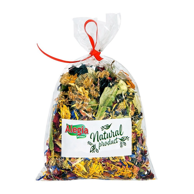 Skład: nagietek, hibiskus, kwiat malwy, chipsy marchewki, mącznik, płatki róży, chaber bławatek.
