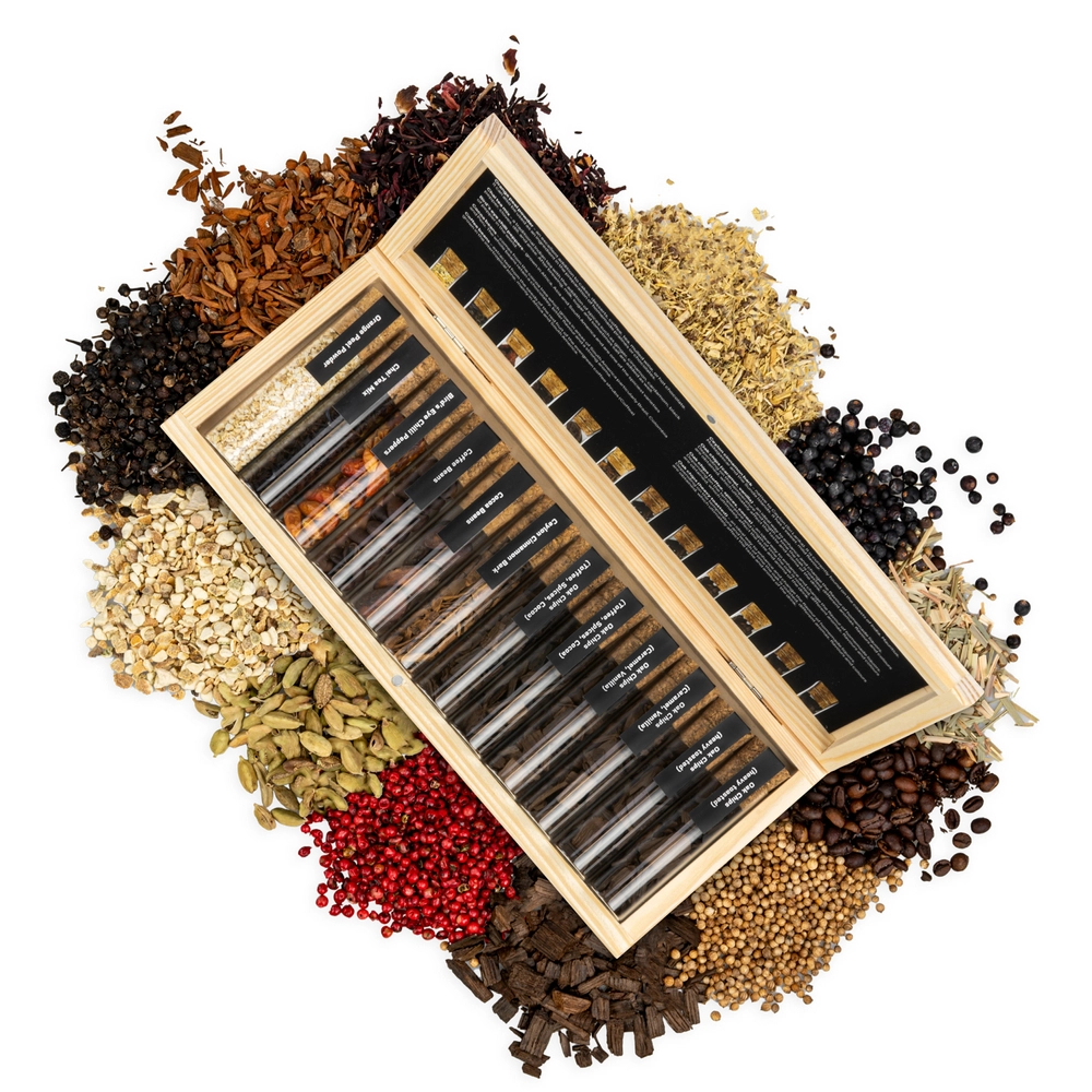 Odkryj nasz wyjątkowy zestaw przypraw, który pozwoli Ci stworzyć whisky o unikalnym smaku i aromacie. W jego skład wchodzi 9 starannie dobranych przypraw zamkniętych w 12-stu poręcznych, szklanych fiolkach (12x 20ml). Każda z nich posiada korkową zatyczkę, aby zapewnić przyprawom pełnię świeżości. Całość umieszczona jest w solidnej i estetycznej skrzyneczce drewnianej, która stanowi doskonałe miejsce do przechowywania oraz uporządkowania Twojej kolekcji aromatycznych dodatków. To idealny prezent dla miłośników whisky, którzy chcą wzbogacić się o nowe doświadczenia i stworzyć swój własny, niepowtarzalny napój.