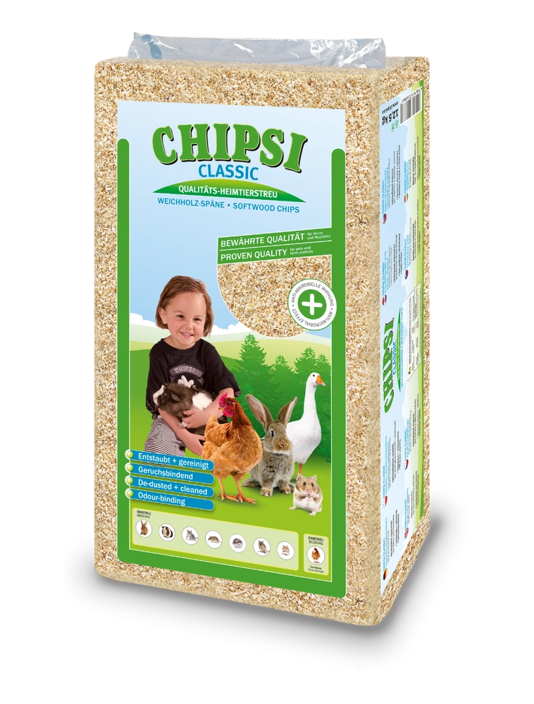 Z CHIPSI CLASSIC zwierzaki poczują się tak, jakby były na świeżym powietrzu! Bezpyłowe zrębki z drewna iglastego, pochodzące ze świerku i jodły, są naturalnie chłonne, wydzielają przyjemny zapach i zapewniają czyste środowisko – autentycznie i przyjemnie naturalne – dla twojego zwierzaka.