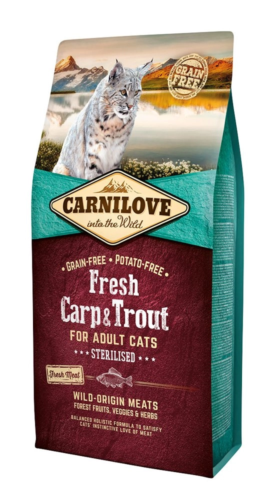 Carnilove Fresh Carp Trout Adult Cat 6 kg to sucha karma dla kotów po zabiegach sterylizacji i kastracji. Jest przeznaczona do codziennego żywienia, które można uzupełniać pokarmem mokrym z tej samej serii. Karma dla kotów przygotowana została z uwzględnieniem ich naturalnych potrzeb. Ten gatunek zwierząt należy do bezwzględnych mięsożerców, co oznacza, że składniki pochodzenia zwierzęcego są podstawą jego diety. W związku z tym karma Carnilove wypełniona jest aż w 80% mięsem. Formuła rybna sprawdzi się szczególnie dobrze u kotów, które są wybredne. Pokarm możesz podawać kilka razy dziennie w porcjach, które kot zje naraz. Karma może być spożywana zarówno wyjęta wprost z opakowania, jak i lekko zwilżona.