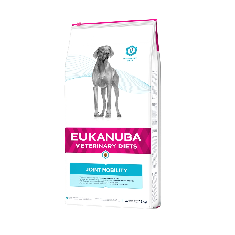 Sucha karma dla psa EUKANUBA Joint Mobility 12kg zapewnia starszym i często schorowanym zwierzętom kompletny, wysokowartościowy posiłek. Unikalna kompozycja wzmacnia naturalną odporność i ułatwia kontrolę stężenia cukru we krwi. Formuła oparta jest na mięsie z kurcząt oraz dodatku mączki rybnej, a także popularnych zbożach. Prócz tego karma zawiera dodatek składników chroniących stawy i wielu wyciągów z ziół, których zadaniem jest utrzymanie starzejącego się organizmu psa w dobrej kondycji. Produkt jest odpowiedni zarówno dla psów ras miniaturowych oraz małych, jak również średnich i dużych, aż po olbrzymie. Pomaga zarówno utrzymać obecną, prawidłową wagę, jak również dokonać jej powolnej, zdrowej redukcji do właściwego poziomu dzięki zastosowaniu odpowiedniego, zaleconego dawkowania.