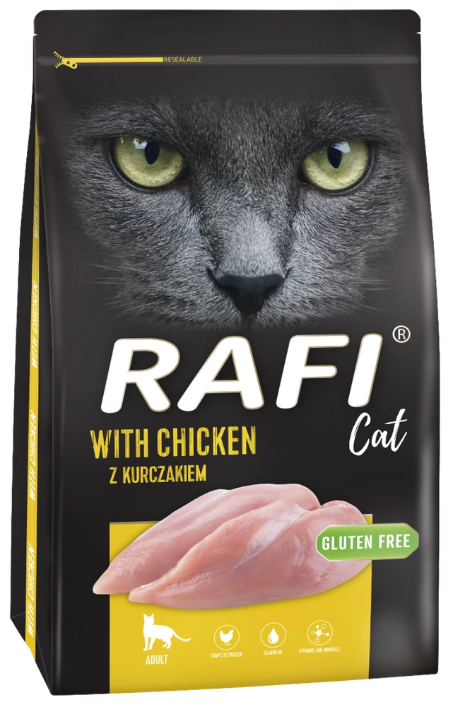 Sucha karma dla kota Rafi Cat z kurczakiem to pełnoporcjowy posiłek dla kotów wszystkich ras. Użyte do produkcji najwyższej jakości, surowce dostarczają do organizmu czworonoga niezbędnych witamin i minerałów. Mięso z kurczaka i produkty z niego pochodzące to bogate źródło łatwostrawnego białka i tłuszczu. Olej z łososia dostarcza naturalnych kwasów tłuszczowych n-6 i n-3. Niezbędna dla kota tauryna, obecna w składzie karmy, odpowiada za prawidłowe funkcjonowanie całego organizmu. Z kolei dodatek drożdży zapewnia suplementację witamin A, E i D3, a także składników mineralnych – cynku, manganu, żelaza, miedzi i jodu. Tak skomponowana receptura wspomaga odporność, pozytywnie wpływa na zęby, kości, sierść i przemianę materii. Dodatkowo hamuje negatywne efekty działania wolnych rodników i pozwala na utrzymanie doskonałej kondycji i zdrowia.