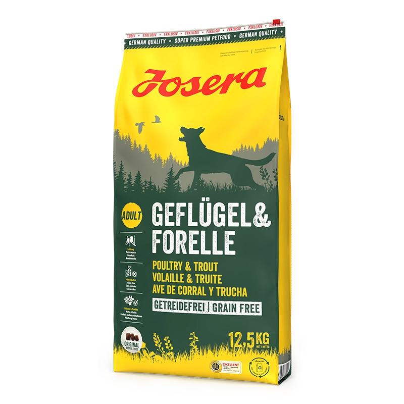 Skład: suszone białko drobiowe 31%, suszone, bataty, mączka z grochu, tłuszcz drobiowy, skrobia ziemniaczana, suszony pstrąg 6%, wysłodki buraczane, hydrolizowane białko drobiowe, drożdże, wytłoki z jabłek, mączka z chleba świętojańskiego, minerały, zioła, owoce, suszony korzeń cykorii (naturalne źródło inuliny), suszone mięso nowozelandzkich małż zielonych (Perna canaliculus).