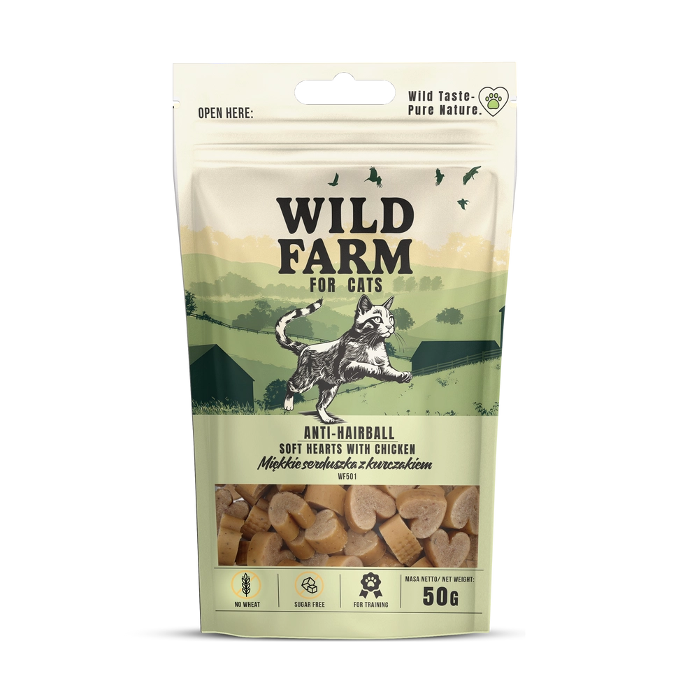 Miękkie serca WILD FARM Hairball to połączenie natury i funkcjonalności. Zdrowy, smakowity i naturalny sposób na codzienną pielęgnację kociego układu trawiennego — bo zdrowie zaczyna się od prostych składników.