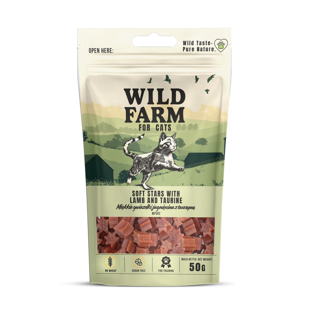 Miękkie gwiazdki WILD FARM z jagnięciną i tauryną to połączenie natury i funkcjonalności. Dostarczają pełni smaku, odżywiają organizm i dbają o dobre samopoczucie Twojego kota – w naturalny, pyszny sposób każdego dnia.