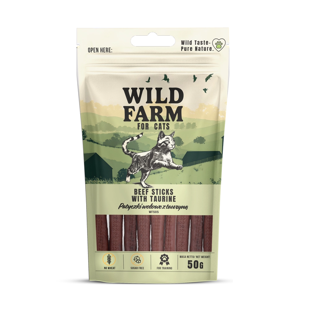 WILD FARM Patyczki wołowe z tauryną to doskonałe połączenie intensywnego smaku wołowiny z funkcjonalnymi składnikami odżywczymi. Mięsny aromat i naturalny skład sprawiają, że koty je uwielbiają, a właściciele mogą być pewni, że podają coś naprawdę zdrowego i wartościowego.