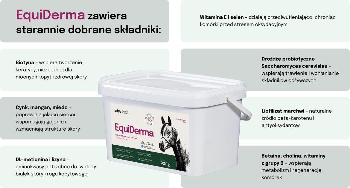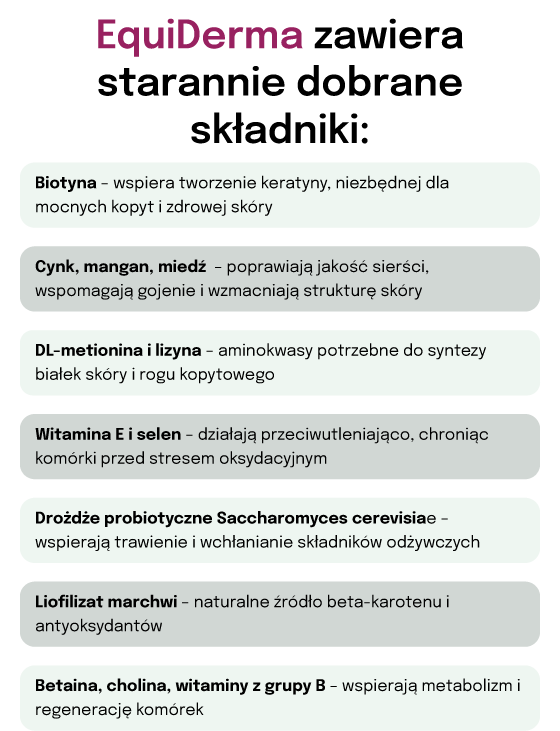• Z osłabioną kondycją skóry, łamliwymi kopytami lub matową sierścią.