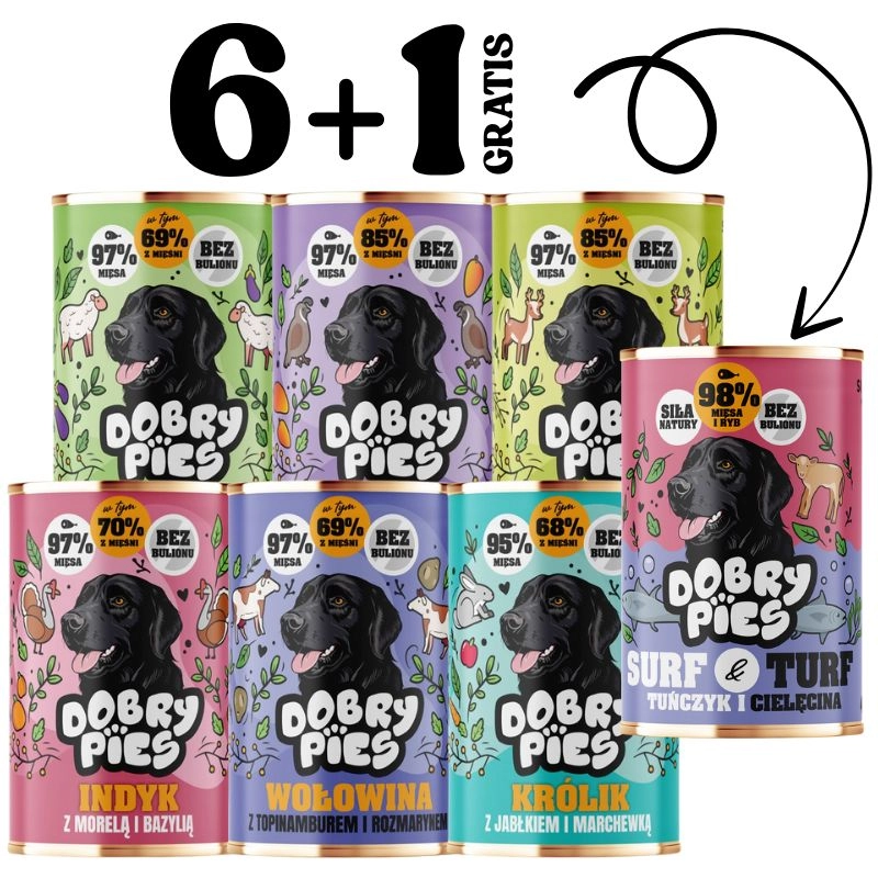 Dobry Pies to codzienna porcja zdrowia i smaku, stworzona z myślą o wybrednych podniebieniach. Naszą karmę opracowaliśmy z dbałością o każdy detal. Co nas wyróżnia? Unikalne połączenia smakowe, które przyciągną aromatem nawet największych niejadków. Jedna z najwyższych na rynku zawartości mięsa, w tym bardzo dużo mięsa pochodzenia mięśniowego, co sprawia, że nasza karma doskonale odpowiada na naturalne potrzeby żywieniowe psa. Prosty skład bez bulionu i wypełniaczy wspiera zdrowe funkcjonowanie i ułatwia trawienie. Starannie dobrana receptura zapewnia Twojemu pupilowi energię na każdy dzień. A Ty wiesz, za co płacisz!
