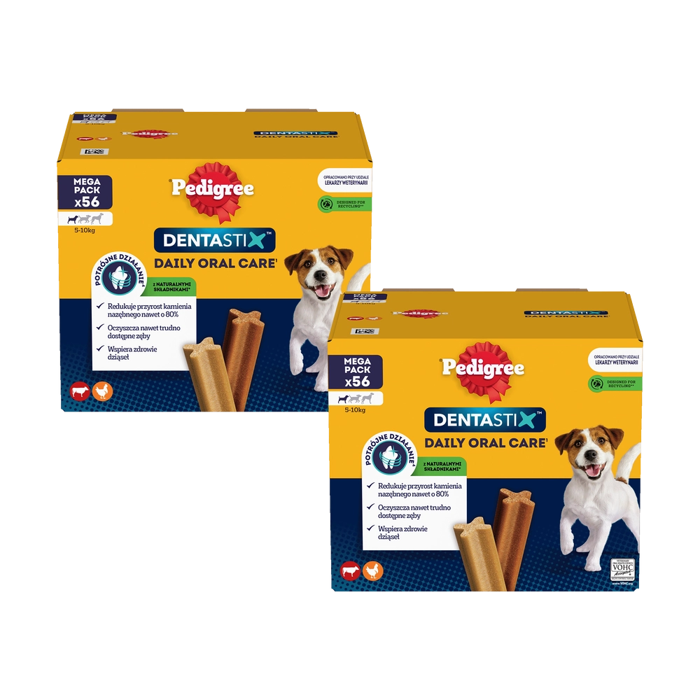 PEDIGREE® DENTASTIX™ – codzienna pielęgnacja jamy ustnej, którą pokochają psy. Dbanie o zdrowie psa zaczyna się od jego zębów i pielęgnacji jamy ustnej. 4 na 5 psów w wieku powyżej 3 lat cierpi na chorobę dziąseł spowodowaną płytką nazębną i kamieniem nazębnym. Udowodniono naukowo, że DENTASTIX™ Daily Oral Care czyści i chroni zęby. Dzięki unikalnemu kształtowi litery X i delikatnej teksturze ściernej przysmaki dentystyczne DENTASTIX™ pomagają usuwać kamień nazębny przy każdym gryzieniu.