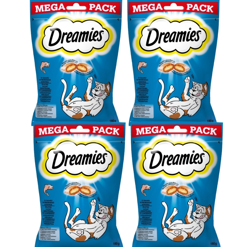 - 4x DREAMIES 180 g – przysmak dla kota, o smaku wybornego łososiaCena: 17,99 zł / szt.