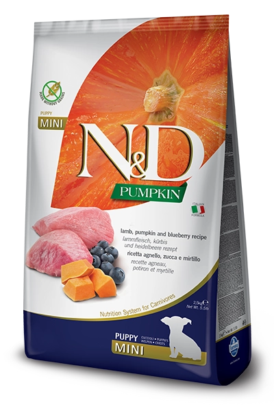 Pełnoporcjowa i bezzbożowa karma dla szczeniąt i ciężarnych lub karmiących suk, z wysokiej jakości mięsem z jagnięciny z ekologicznych hodowli i borówką amerykańską z dodatkiem dyni, funkcjonalnych warzyw i owoców oraz zawierająca wyciągi roślinne.