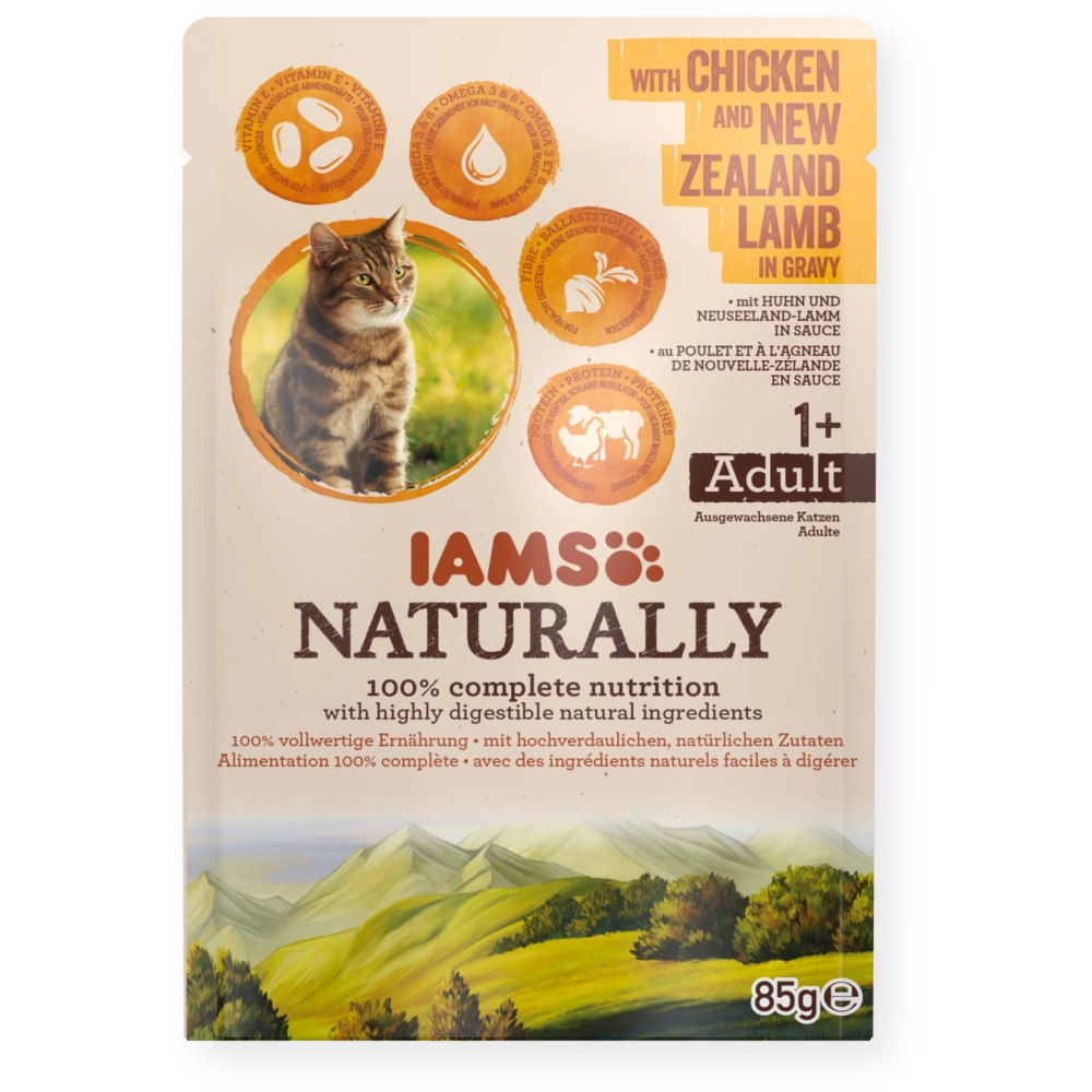 IAMS Naturally dla dorosłych kotów z kurczakiem i jagnięciną nowozelandzką, w sosie to w 100% kompletna i zbilansowana karma dla Twojego czworonożnego przyjaciela. Nasza receptura jest oparta na starannie wybranych, wysokostrawnych naturalnych składnikach, takich jak kurczaki hodowane na terenie Unii Europejskiej oraz jagnięcina z nowozelandzkich otwartych pastwisk, na których zwierzęta są wypasane przez cały rok. Te składniki są niezbędne by Twój kot był zdrowy i silny. Oprócz czystej przyjemności z jedzenia, IAMS Naturally oferuje wiele dodatkowych korzyści dla kotów: witamina E to naturalny przeciwutleniacz, który wspiera fizjologiczne mechanizmy obronne. IAMS Naturally zawiera także kwasy tłuszczowe Omega-3 i Omega-6 pochodzące z ryb oraz olej słonecznikowy, który zapewnia lśniącą sierść i zdrową skórę. Lekkostrawne źródło białka, jakim jest kurczak i jagnięcina sprawiają, że nasza karma nie tylko lepiej smakuje i pachnie, ale również dostarcza niezbędnych aminokwasów zapewniających silne i nieotłuszczone mięśnie.