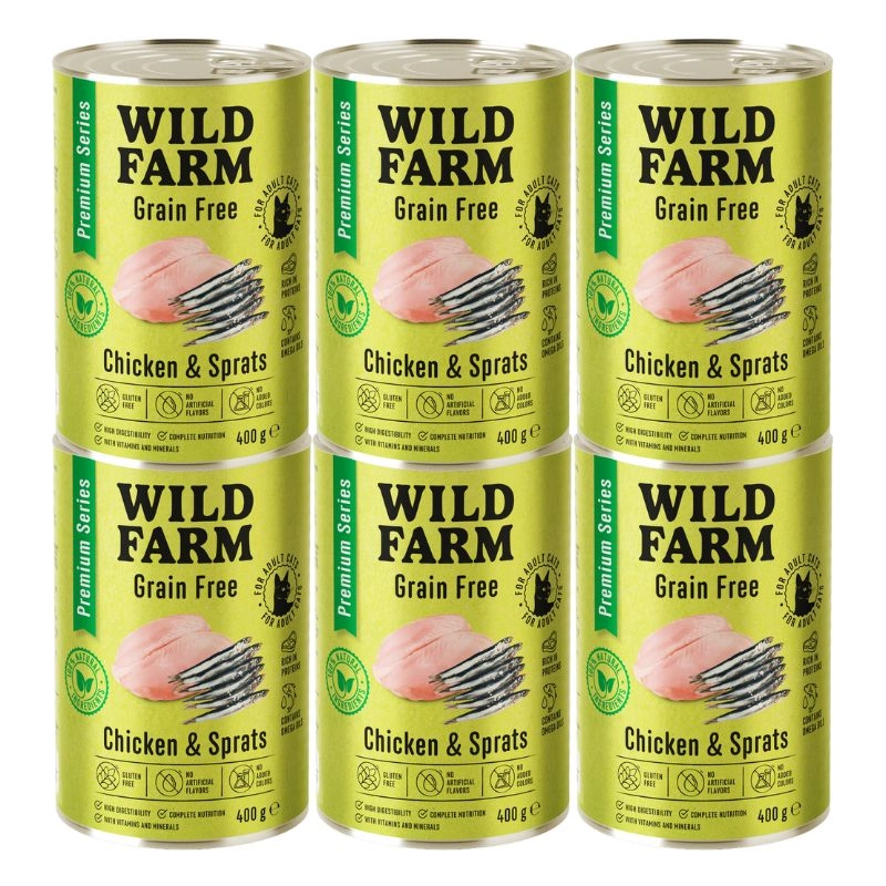 - 6x WILD FARM Premium Grain Free Chicken and Sprats 400g - bezzbożowa karma dla kotaCena: 5,90 zł / szt.