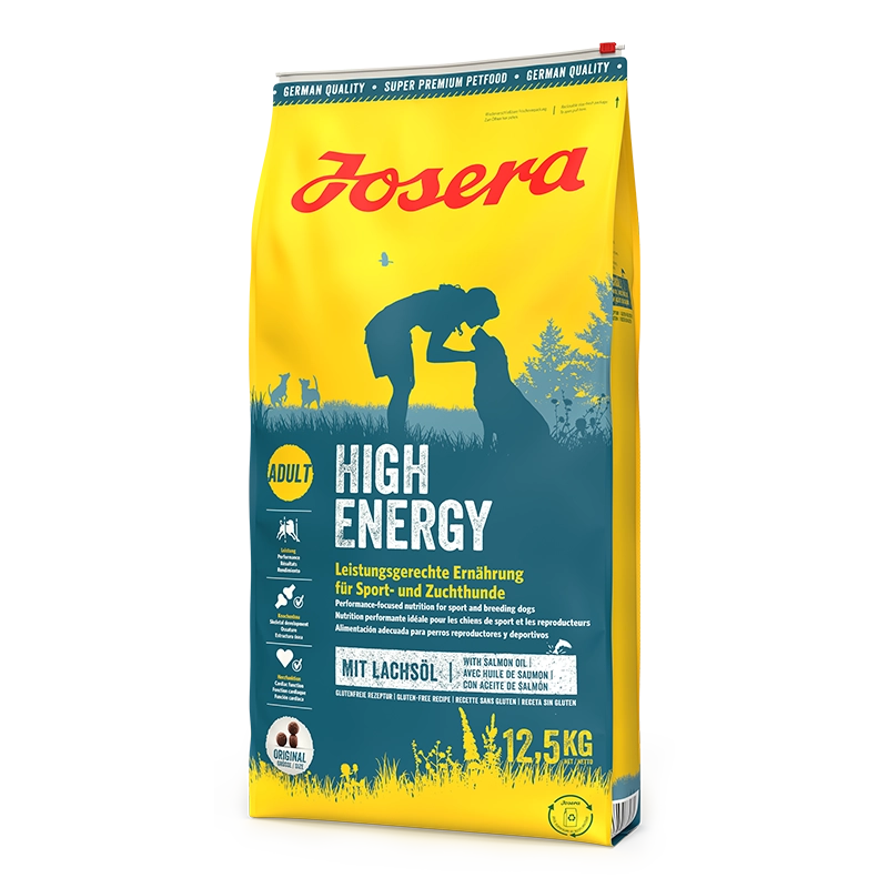 Wysokoenergetyczna sucha karma przeznaczona dla psów sportowych i pracujących. Może być podawana również sukom w ciąży oraz sukom w okresie karmienia. Receptura karmy Josera High Energy jest odpowiednia dla psów o dużej aktywności fizycznej, dzięki wysokiej kaloryczności.
