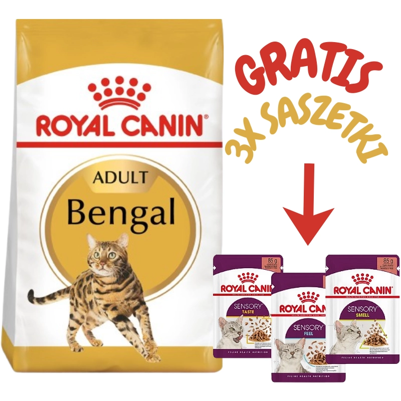 ROYAL CANIN® Bengal Adult to karma opracowana specjalnie dla kotów bengalskich. Dzięki wysokiemu poziomowi białka i odpowiedniej zawartości tłuszczu, karma sprzyja utrzymaniu masy mięśniowej kotów bengalskich, pozwalającej na prowadzenie charakterystycznego dla tych kotów niezwykle aktywnego trybu życia.