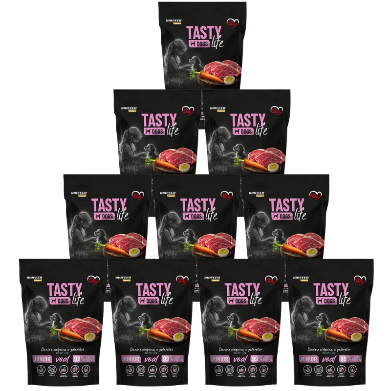- 10x Tasty Dogs Life Junior Danie z cielęciną w galaretce 500gCena: 8,49 zł / szt.