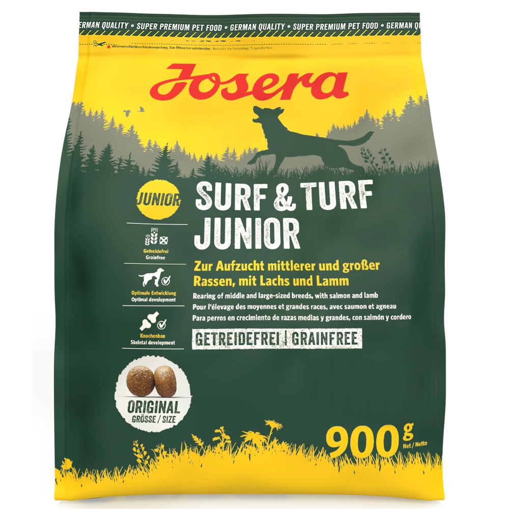 Karma Josera Surf & Turf Junior z wysokiej jakości białkiem jagnięcym i łososia zapewnia dorastającym psom pełnowartościowe i smaczne menu każdego dnia. Nie zawiera białka drobiowego, dzięki czemu jest odpowiednim posiłkiem dla pupili z alergią na drób. Zawiera wszystko, czego psy potrzebują dla zdrowego rozwoju.