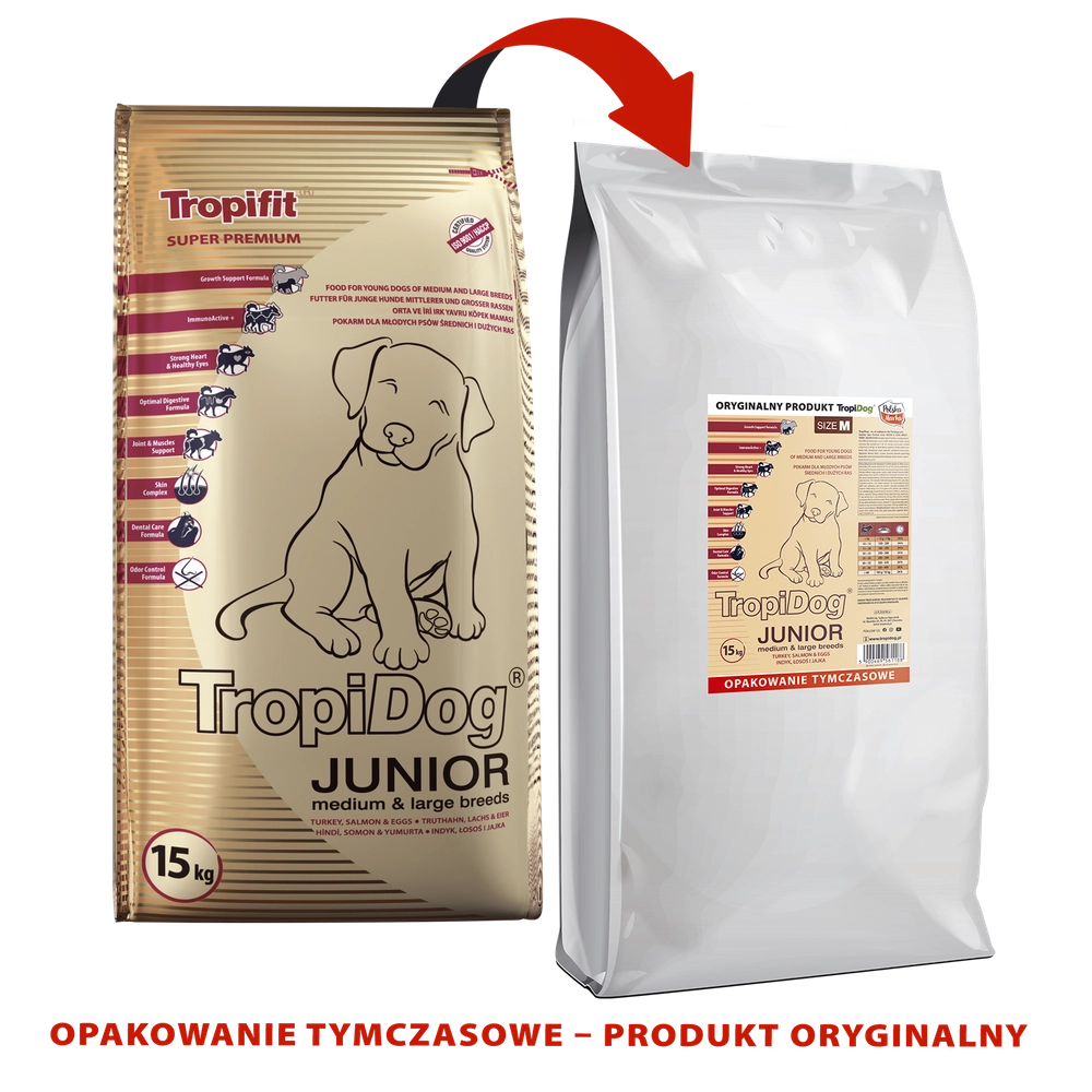 Szukasz idealnego żywienia dla swojego szczenięcia średniej lub dużej rasy? Karma TROPIDOG SUPER PREMIUM Junior medium & large breed turkey, salmon & eggs 15 kg może być dobrym wyborem. Jest to sucha karma dla młodych psów średnich i dużych ras, która zapewnia im prawidłowy rozwój bez niepotrzebnego obciążenia organizmu. Pokarm zawiera dużą ilość białka pochodzącego przede wszystkim z jaj, indyka oraz łososia. Dzięki temu karma jest niezwykle odżywcza, a przy tym dobrze przyswajalna. Kompleks składników chondroprotekcyjnych wspiera zdrowie układu ruchu, zapobiegając degeneracji stawów już w okresie młodzieńczym. Prebiotyki gwarantują właściwy proces trawienia oraz regularne wypróżnienia. Budują również prawidłową florę bakteryjną jelit, a w połączeniu z antyoksydantami gwarantują wzmocnienie naturalnej odporności szczeniąt. Formuła dentystyczna dba o zdrowie zębów – usuwa z nich osad, redukuje kamień i utrzymuje w zdrowiu dziąsła. Dzięki tej karmie Twoje szczenię będzie zdrowo rosło, utrzymując prawidłową wagę ciała.