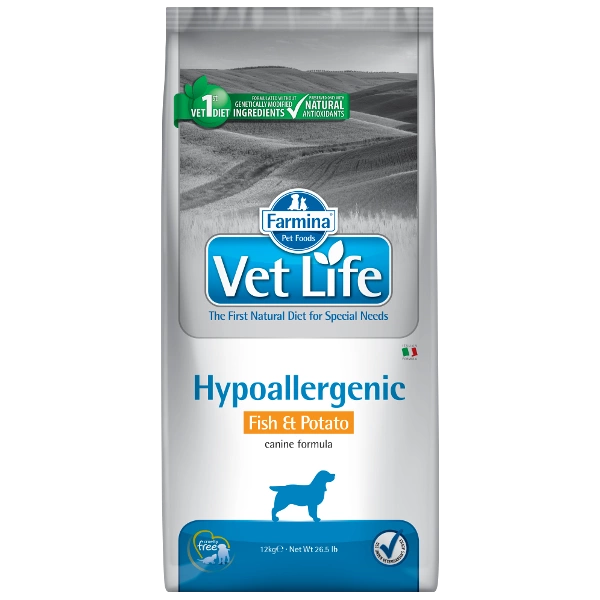 Farmina Vet Life Hypoallergenic Fish & Potato to pełnoporcjowa dietetyczna karma dla psów przy bniżaniu nietolerancji składników i substancji odżywczych; wspomaganie funkcji skóry w przypadku dermatozy i wypadania sierści.