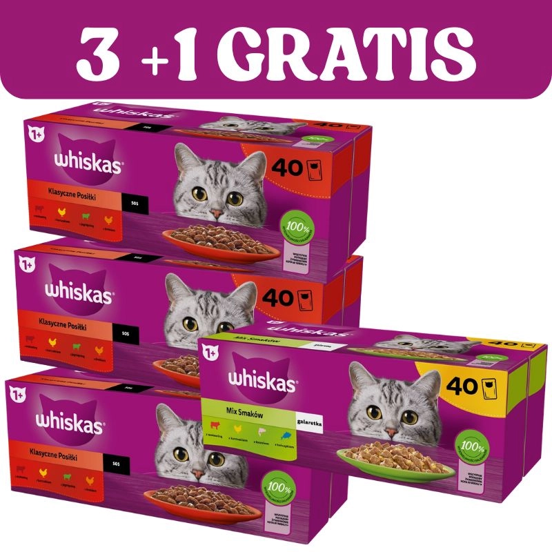 Nasze posiłki Whiskas Klasyczne Posiłki w sosie zostały specjalnie przygotowane tak, aby zachować naturalne zalety i smak wysokiej jakości składników. Sprawią, że Twój kot przybiegnie do miski szybciej niż kiedykolwiek wcześniej! Koci przyjaciel rozsmakuje się w jednym z czterech wariantów, kawałki z: wołowiną, kurczakiem, jagnięciną, drobiem. Ten smaczny pokarm w wygodnej saszetce zawiera cynk, który wspiera zdrowie skóry i sierści, a odpowiedni bilans minerałów pomaga zadbać o kondycję dróg moczowych Twojego pupila. Od figlarnego kocięcia po wspaniałego dorosłego kota – nasze smakowite receptury zostały opracowane z myślą o tym, aby kot w każdym wieku mruczał z zadowolenia w porze posiłku i nie tylko.