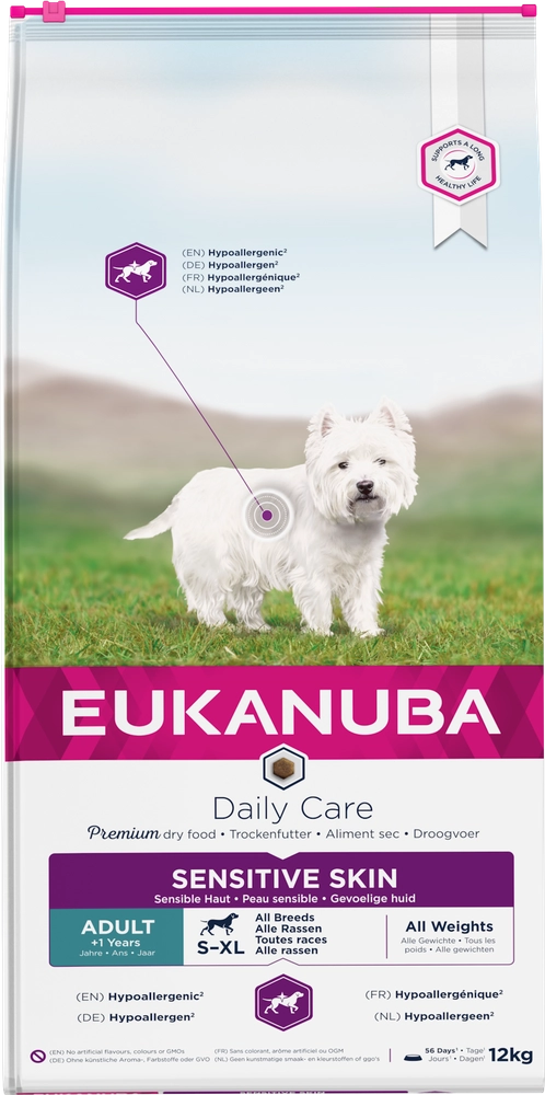 - Regularne podawanie psu karmy Eukanuba Daily Care Sensitive Skin sprawia, iż pies staje się zdrowszy, jego skóra i sierść pięknieje a pupil staje się szczęśliwszy oraz skory do zabawy.