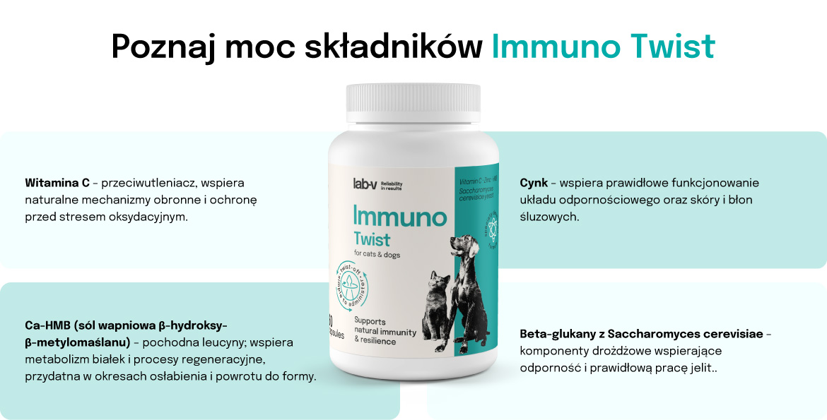 Immuno Twist dostarcza witaminę C i cynk – niezbędne w prawidłowym funkcjonowaniu układu odpornościowego – oraz HMB, które wspiera przemiany białek i powrót do dobrej kondycji. Obecność komponentów drożdżowych S. cerevisiae sprzyja równowadze jelitowej, co dodatkowo wspiera naturalne mechanizmy obronne.