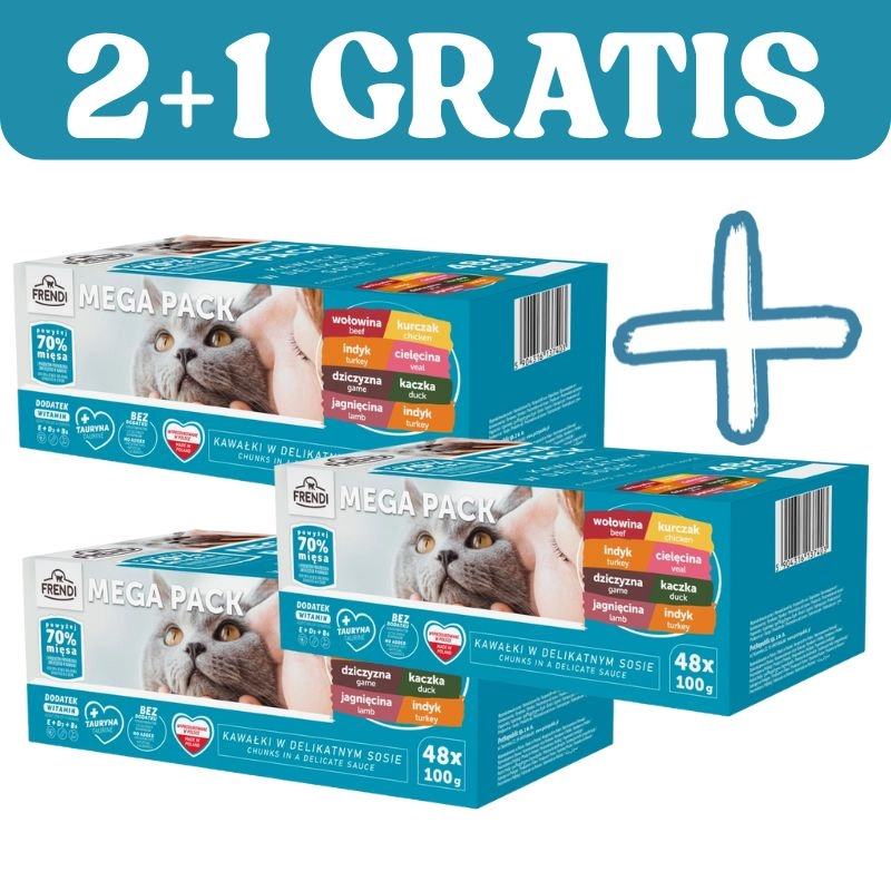 Frendi to marka stworzona z miłości do zwierząt przez profesjonalistów z wieloletnim doświadczeniem. Karma Frendi to bardzo dobry jakościowo oraz niezwykle korzystny cenowo, zbilansowany posiłek dla kocich łakomczuchów wszystkich ras. Karma przygotowana z najwyższą starannością w centrum Polski, z najlepszej jakości, świeżych surowców mięsnych. Zawiera powyżej 70% surowca mięsnego w kawałkach w delikatnym sosie. Bogata w składniki odżywcze oraz witaminy zapewni kotu zdrowy, pełnoporcjowy posiłek na cały dzień!