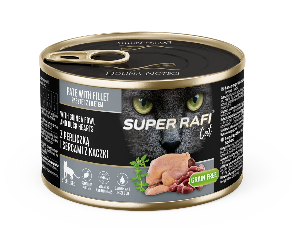 |  | DOLINA NOTECI Super Rafi Cat P&F z perliczką i sercami z kaczki dla kotów sterylizowanych 24x185g | 119,76 zł | 114,96 złOszczędzasz (4.01%) |