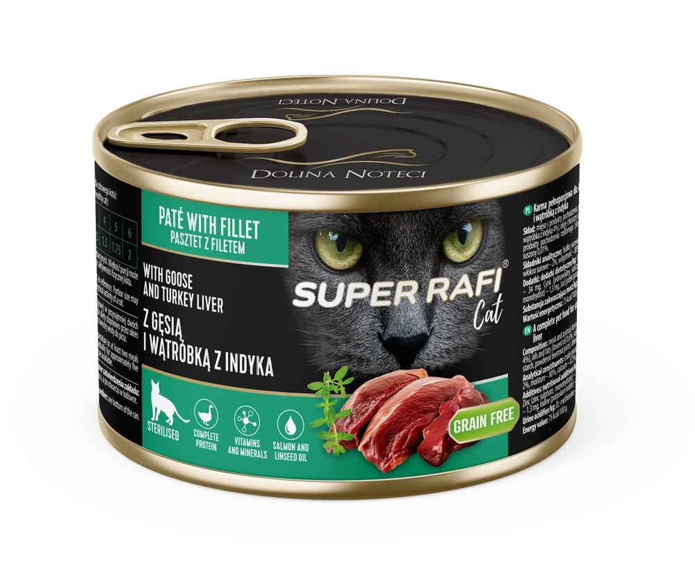 Formuła Super Rafi Cat z gęsią i wątróbką z indyka została opracowana specjalnie z myślą o kotach po zabiegu sterylizacji. Zredukowana zawartość tłuszczu oraz wzbogacenie receptury w L-karnitynę i DL-metioninę wspomagają utrzymanie prawidłowej masy ciała oraz zdrowia układu moczowego.