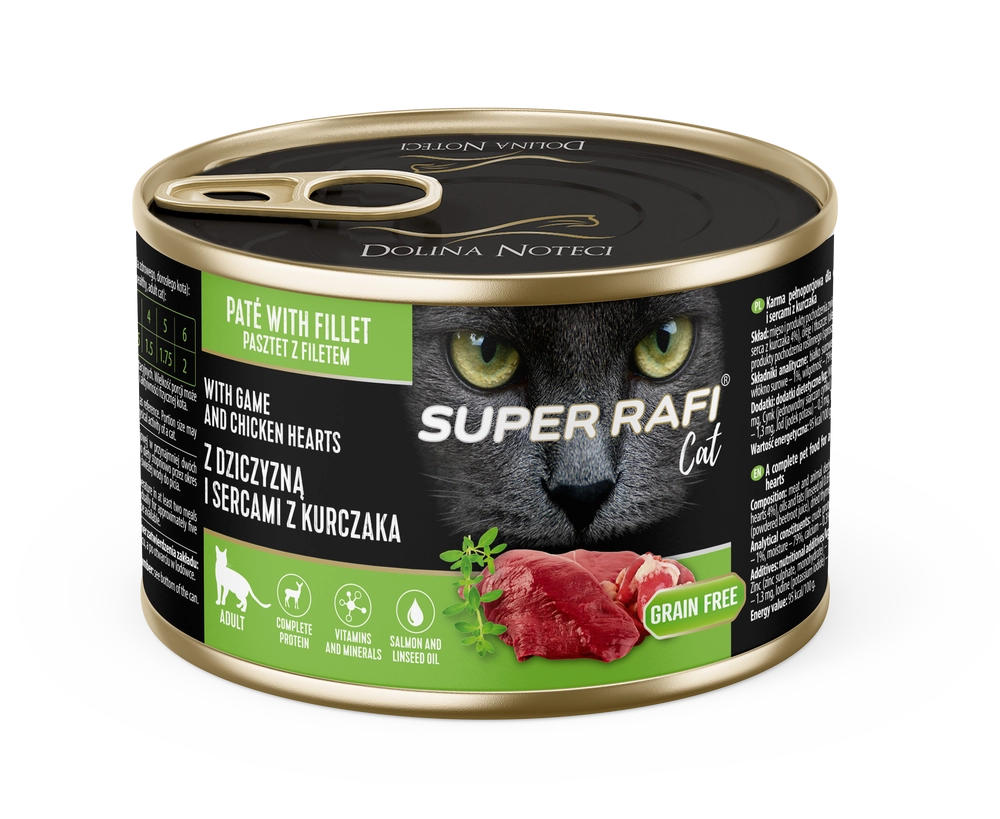 Super Rafi Cat z dziczyzną i sercami z kurczaka to pełnoporcjowa karma, która w pełni pokrywa dzienne zapotrzebowanie dorosłych kotów na wszystkie niezbędne składniki odżywcze. Wysoka zawartość mięsa i produktów pochodzenia zwierzęcego (70%), w tym filetu z kurczaka oraz mięsa z dziczyzny i serc, gwarantuje źródło wysokostrawnego białka o wysokiej wartości biologicznej.