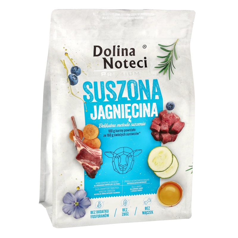 Karma Dolina Noteci Premium -jagnięcina to pełnoporcjowa suszona karma bytowa dla dorosłych psów wszystkich ras, pokrywająca w 100% ich dzienne zapotrzebowanie na wszystkie składniki odżywcze, w tym minerały i witaminy. Jej mniej inwazyjna metoda suszenia ciepłym powietrzem powoduje, że karma zachowuje wysoką wartość odżywczą i biologiczną wszystkich świeżych surowców wykorzystanych w jej produkcji. 80% składu karmy suszonej to mięso i podroby z jagnięciny, wołowiny, wieprzowiny i dorsza z wyjątkowo wysokim, bo aż 40% udziałem mięśni szkieletowych. Mięso zawiera kreatynę, która jest źródłem energii dla mięśni, przez co stanowi ważny element diety psa. Kompozycja wszystkich surowców, z wysokim udziałem mięsa z jagnięciny oraz dorsza, oprócz źródeł wszystkich aminokwasów egzogennych oraz długołańcuchowych kwasów tłuszczowych: eikozapentaenowego (EPA) i dokozaheksaenowego (DHA) zapewnia prawidłową strawność i biodostępność składników odżywczych. Jagnięcina, jako surowiec o wyjątkowych walorach sensorycznych, daje gwarancję wysokiej smakowitości karmy suszonej. Prawidłowy profil wielonienasyconych kwasów tłuszczowych utrzymany jest także dzięki dodatkowi oleju lnianego, bogatego w kwas linolenowy. W przeciwieństwie do karm suchych, Dolina Noteci Premium -jagnięcina nie zawiera często alergizujących zbóż, które zostały zastąpione innym rodzajem węglowodanu jakim jest skrobia ziemniaczana. Dodatek lecytyny optymalizuje wchłanianie wszystkich składników odżywczych, poprawiając trawienie tłuszczów. Dodatkowo pomaga utrzymać sierść w dobrej kondycji oraz redukuje występowanie zmian neurozwyrodnieniowych związanych ze starzeniem się mózgu. Chroni także komórki organizmu psa przed stresem środowiskowym. Lecytyna wchodzi w skład błon komórkowych i jest niezbędna do funkcjonowania układu nerwowego oraz bierze udział w gospodarce cholesterolu. Nasiona babki płesznik reguluje pracę przewodu pokarmowego, a owoce borówki (zawierające procyjanidyny i flawonoidy), cukinia, marchewka oraz rozmaryn są źródłem substancji biologicznie czynnych i przyczyniają się do hamowania procesów oksydacyjnych, dzięki czemu spowalniają tempo starzenia się organizmu. Szczególnie cennym dodatkiem dla funkcjonowania całego organizmu są prebiotyki, których źródłem jest inulina z cykorii. Użyte do produkcji karmy produkty drożdży są połączeniem trzech inaktywowanych szczepów drożdży (Saccharomyces cerevisiae AQP 12260, Saccharomyces cerevisiae AQP 12988, Cyberlindnera jadinii AQP 12549), które zostały precyzyjnie dobrane tak aby działały w sposób synergistyczny. Taka kombinacja pozwala na codzienne wspieranie układu pokarmowego psa i zachowanie równowagi mikroflory jelitowej. Dodatkowo przyczyniają się do wzmocnienia odporności organizmu psa. Skład surowcowy został tak skomponowany, aby karma zawierała fosfor tylko w formie organicznej (naturalnie występujący w produktach pochodzenia zwierzęcego i roślinnego). Odpowiedni stosunek wapnia i fosforu, gwarantuje prawidłowe współdziałanie układów kostnego i mięśniowego. Dzięki specjalnej metodzie produkcji, precyzyjnemu doborowi surowców oraz obecności suszonego rozmarynu, karma ta jest produktem lekkostrawnym, charakteryzującym się wysokimi współczynnikami strawności składników odżywczych, idealnie dopasowanym do wymogów żywienia dorosłych psów. Przestrzegając zalecanych ilości podawanej karmy, opiekun ma gwarancję odpowiedniego odżywienia psa, bez pojawienia się ryzyka nadwagi i otyłości. Należy pamiętać o zapewnieniu psu stałego dostępu do świeżej wody do picia, która w sposób naturalny wspomaga przyswajanie składników w niej zawartych. Na produkcie może występować biały nalot, który jest efektem naturalnie zachodzącej krystalizacji składników mięsa. Nie ma on wpływu na jakość karmy. Na produkcie może występować biały nalot, który jest efektem naturalnie zachodzącej krystalizacji składników mięsa. Nie ma on wpływu na jakość karmy.