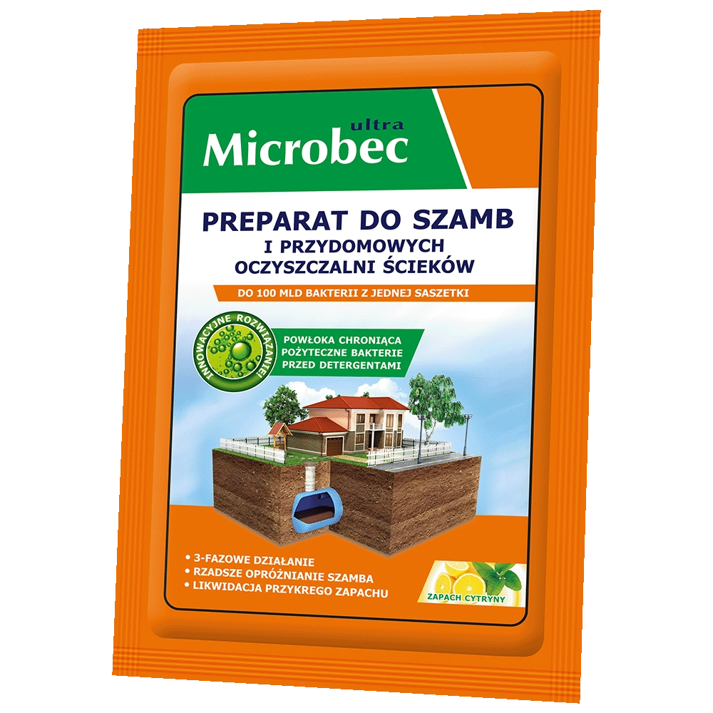 Działanie preparatu: Microbec zawiera wyspecjalizowane kultury bakterii oraz enzymy, które przyspieszają naturalny proces rozkładu resztek organicznych, m.in. nieczystości, tłuszczy, resztek roślinnych, papieru. Obecne w preparacie bakterie ulegają bardzo szybkiemu namnażaniu i już po godzinie od zastosowania ich liczebność w szambie osiąga poziom nawet kilkuset miliardów sztuk. Produkt działa 3-fazowo: zapewnia szybki i skuteczny rozdział zanieczyszczeń, które podlegają upłynnieniu, a następnie enzymatycznemu rozkładowi do całkowicie bezpiecznych i przyjaznych środowisku związków prostych i wody. Pozwala to na oczyszczenie szamba z nagromadzonych osadów i zatorów, zmniejsza częstotliwość opróżniania zbiornika i zapewnia wysoką sprawność działania oczyszczalni. Preparat nie powoduje korozji urządzeń sanitarnych, jest bezpieczny dla ludzi, zwierząt i środowiska.