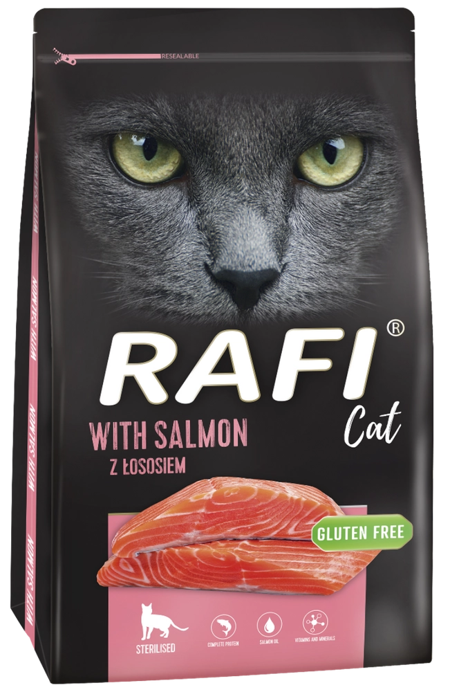 Koty po zabiegu sterylizacji wymagają żywienia dopasowanego do ich potrzeb. Sucha karma dla kota Rafi Cat z łososiem to specjalnie wyselekcjonowane składniki, dobrane w proporcjach, które sprzyjają utrzymaniu dobrej kondycji i zdrowia u sterylizowanych czworonogów. Łosoś i produkty pochodzenia zwierzęcego zapewniają wysoką zawartość białka i tłuszczu, dzięki któremu składniki odżywcze są łatwiej przyswajalne. Stanowiący dodatek olej z łososia to doskonałe źródło kwasów z rodziny n-3 i n-6. Optymalny poziom witamin i minerałów, a także zawartych w karmie składników o charakterze prebiotycznym, sprawia, że jej spożywanie przyczynia się do poprawy działania przewodu pokarmowego, perystaltyki jelit i odporności. Witamina A wpływa na prawidłowe działanie wzroku, E zapobiega powstawaniu szkodliwych efektów działania wolnych rodników, a D3 odpowiada za utrzymanie zdrowych zębów i kości. Dzięki wysokiej zawartości włókien surowych, produkt charakteryzuje się mniejszą wartością energetyczną i odpowiada potrzebom żywieniowym kotów po zabiegu sterylizacji, narażonym na otyłość lub nadwagę.