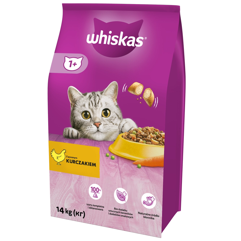 WHISKAS z pysznym kurczakiem to pełnoporcjowy suchy pokarm z pasztecikami kruchymi na zewnątrz i z delikatnym nadzieniem w środku, które koty uwielbiają. Granulki z wysokiej jakości białkiem są starannie opracowane, aby dać Twojemu kociemu przyjacielowi wszystko, czego potrzebuje do mruczenia. Kompletna i zbilansowana receptura ze zdrowymi i apetycznymi warzywami - marchewką i groszkiem - zapewnia Twojemu kotu perfekcyjną dawkę wszystkich niezbędnych składników odżywczych - w tym witamin i minerałów. Dzięki karmie Whiskas, która jest przygotowana z wysokiej jakości składnikami pochodzącymi wyłącznie od zaufanych dostawców, Twój kot jest szczęśliwy, zdrowy i chętnie przybiega do miski za każdym razem w porze karmienia.