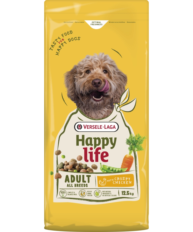 Happy Life Adult with Chicken to smaczna, urozmaicona karma, dostarczająca aktywnym, dorosłym psom wszystkich potrzebnych składników odżywczych. W 100% pełnoporcjowa i zbilansowana: ta karma zapewnia odpowiednią równowagę białek, tłuszczów, węglowodanów, witamin i minerałów, niezbędnych dla zdrowia i dobrego samopoczucia Twojego psa.