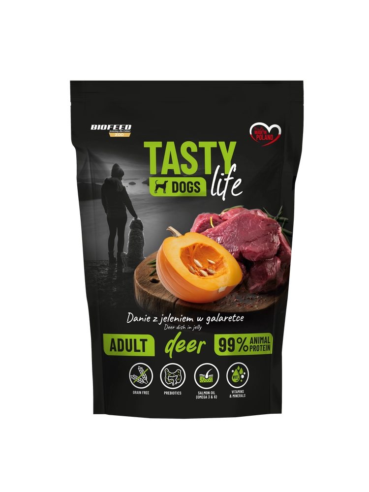 • Jeleń – delikatna dziczyzna o wysokiej smakowitości. Źródło chudego, łatwostrawnego białka bogatego w żelazo, cynk i witaminy z grupy B. Doskonała alternatywa dla psów z alergiami lub nietolerancjami pokarmowymi.